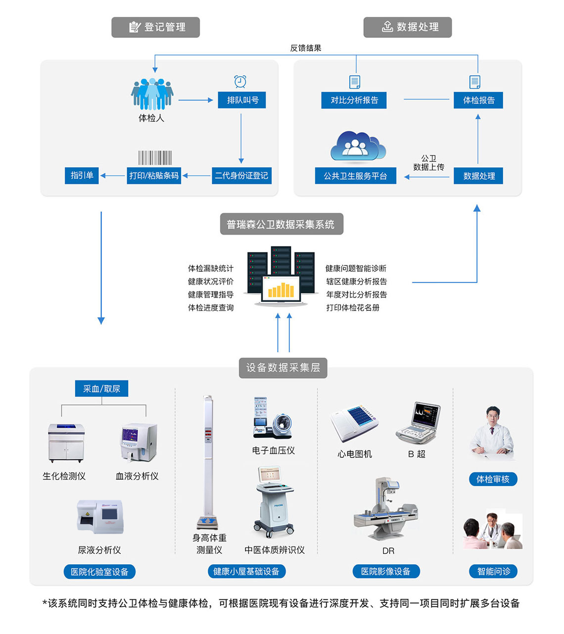 普瑞森公共衛(wèi)生數(shù)據(jù)智能采集系統(tǒng)院內(nèi)專業(yè)體檢方案,是在基層醫(yī)療機構(gòu)搭建一套適用于公衛(wèi)體檢、健康體檢、健康教育、健康管理為一體的健康管理中心,深度集成公共衛(wèi)生體檢基礎(chǔ)設(shè)備,無縫鏈接醫(yī)療機構(gòu)現(xiàn)有的心電設(shè)備、超聲檢查設(shè)備、化驗室設(shè)備,結(jié)合內(nèi)科、外科、中醫(yī)科等科室專業(yè)問診,實現(xiàn)居民快速建檔,體檢數(shù)據(jù)自動采集,體檢報告自助打印、體檢數(shù)據(jù)自動上傳至當(dāng)?shù)鼗竟残l(wèi)生服務(wù)平臺的全功能應(yīng)用。