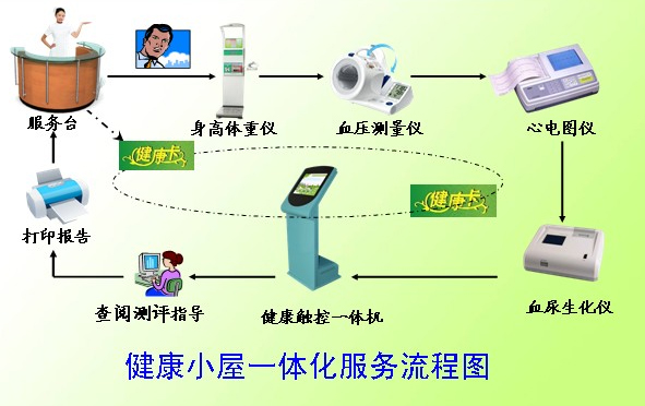 健康小屋操作流程 1、社區(qū)老人先到服務(wù)臺(tái)憑借一卡通標(biāo)簽換取“身份識(shí)別卡”; 2、將卡在其中之一的體檢測(cè)評(píng)單元的登陸裝置正確識(shí)別后,卡內(nèi)加密數(shù)據(jù)經(jīng)由主機(jī)通過網(wǎng)