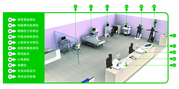 健康體檢小屋 健康體驗小屋完善的身高、體重、血壓、血糖測量、人體成分檢測、心理健康測試、10分鐘出結果,一站式服務模式,健康數據同步錄入數